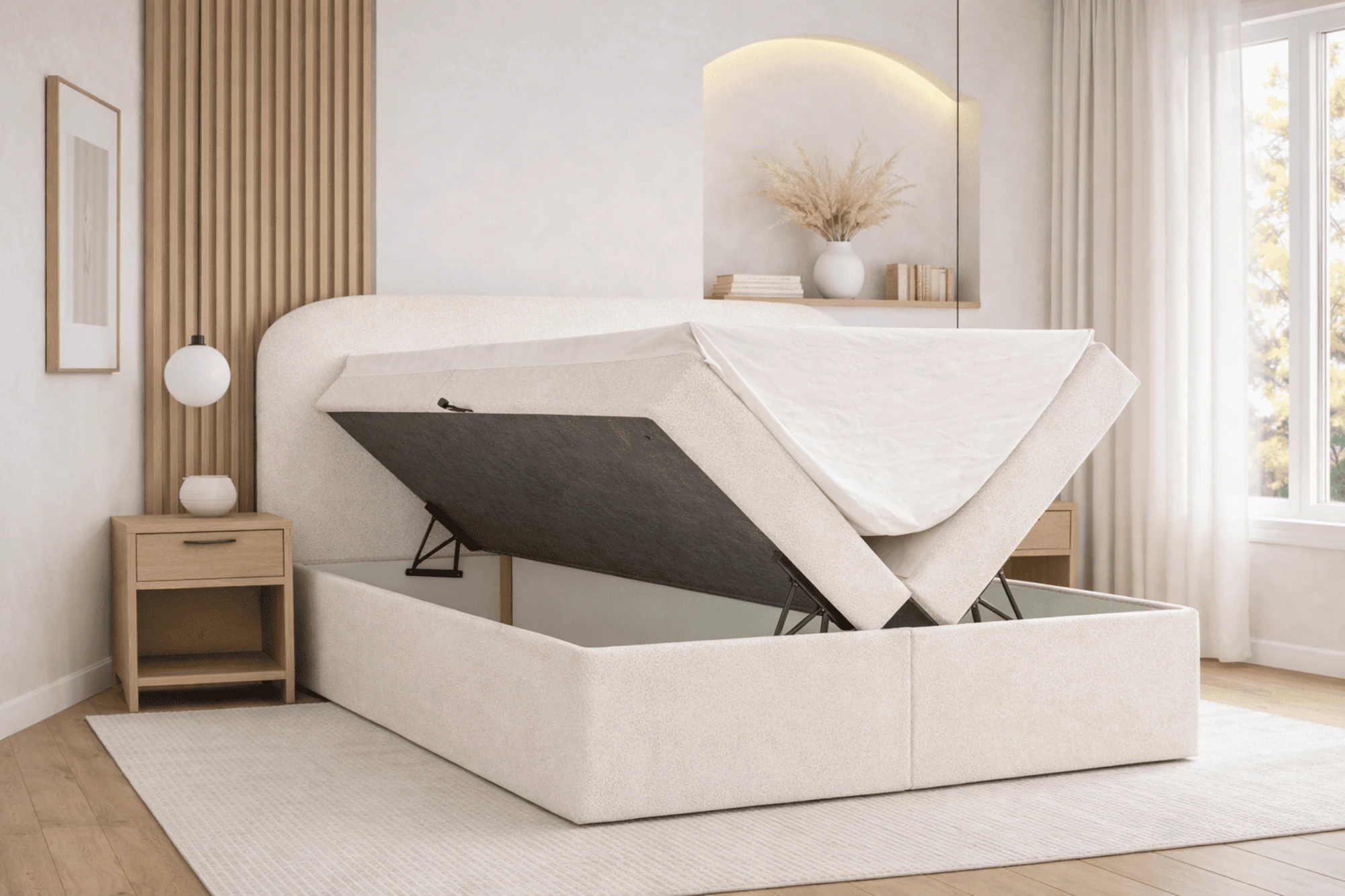 Der luxuriöse Bouclé-Stoff verleiht dem Boxspringbett nicht nur eine angenehme Weichheit, sondern auch eine stilvolle Optik. Der robuste Rahmen sorgt für Stabilität und Langlebigkeit, während ein praktischer Federmechanismus den Zugang zum großzügigen Stauraum unter der Liegefläche mühelos ermöglicht. Der zusätzliche Topper steigert den Komfort und sorgt für ein noch angenehmeres Liegegefühl. Das Bett ist die perfekte Lösung für alle, die neben Funktionalität auch besonderen Wert auf hohen Komfort legen.