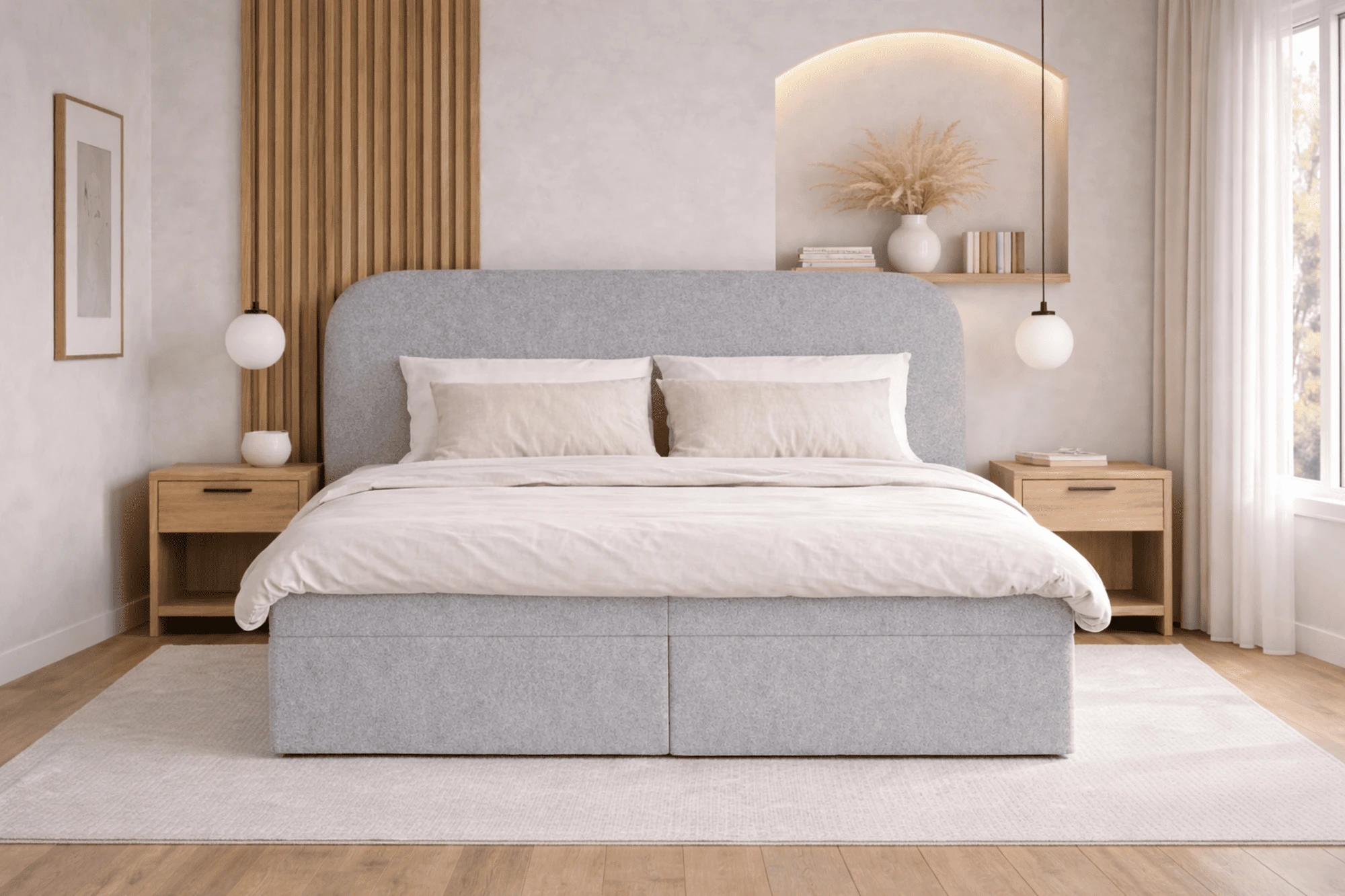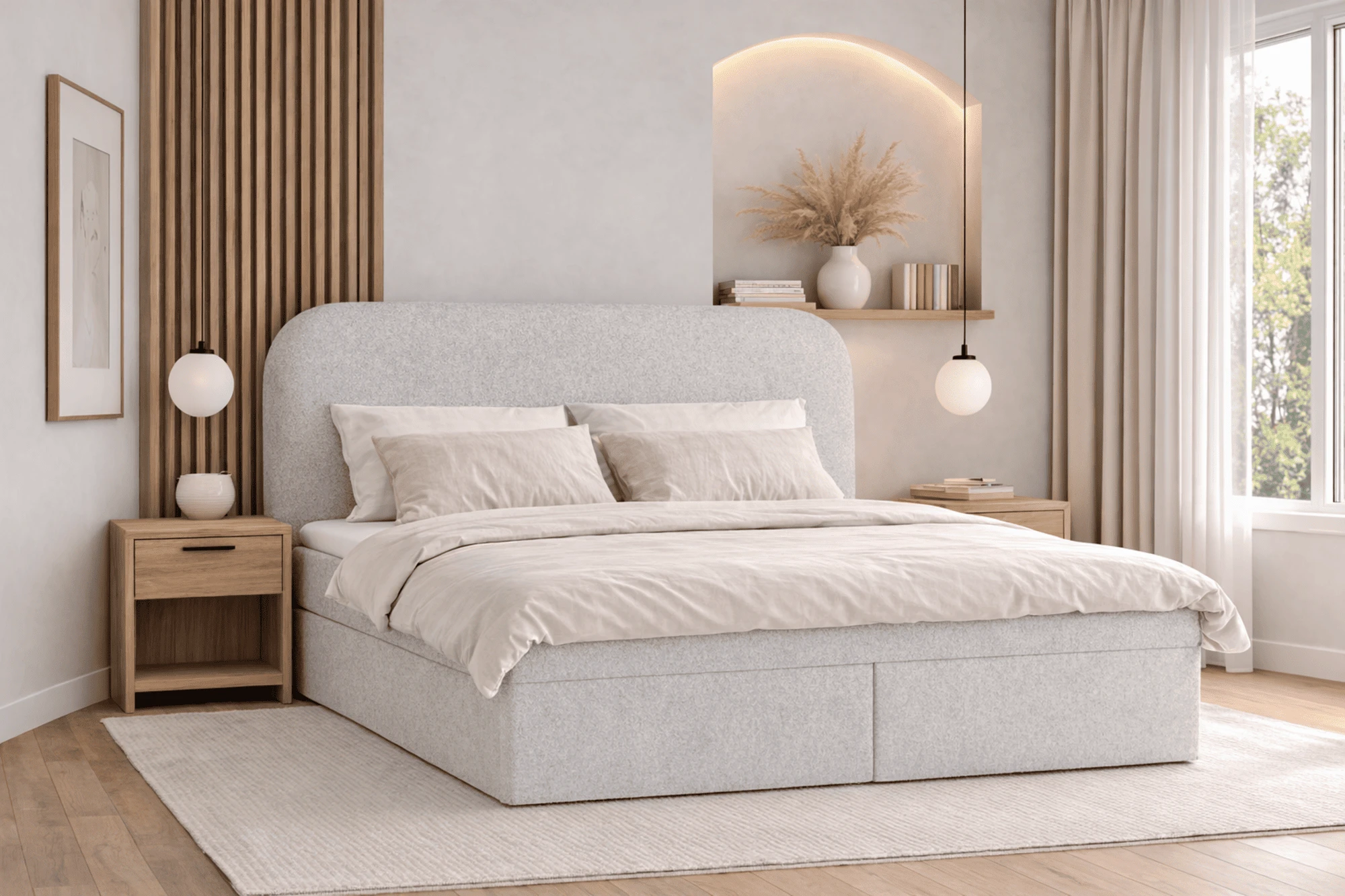 Der luxuriöse Bouclé-Stoff verleiht dem Boxspringbett nicht nur eine angenehme Weichheit, sondern auch eine stilvolle Optik. Der robuste Rahmen sorgt für Stabilität und Langlebigkeit, während ein praktischer Federmechanismus den Zugang zum großzügigen Stauraum unter der Liegefläche mühelos ermöglicht. Der zusätzliche Topper steigert den Komfort und sorgt für ein noch angenehmeres Liegegefühl. Das Bett ist die perfekte Lösung für alle, die neben Funktionalität auch besonderen Wert auf hohen Komfort legen.