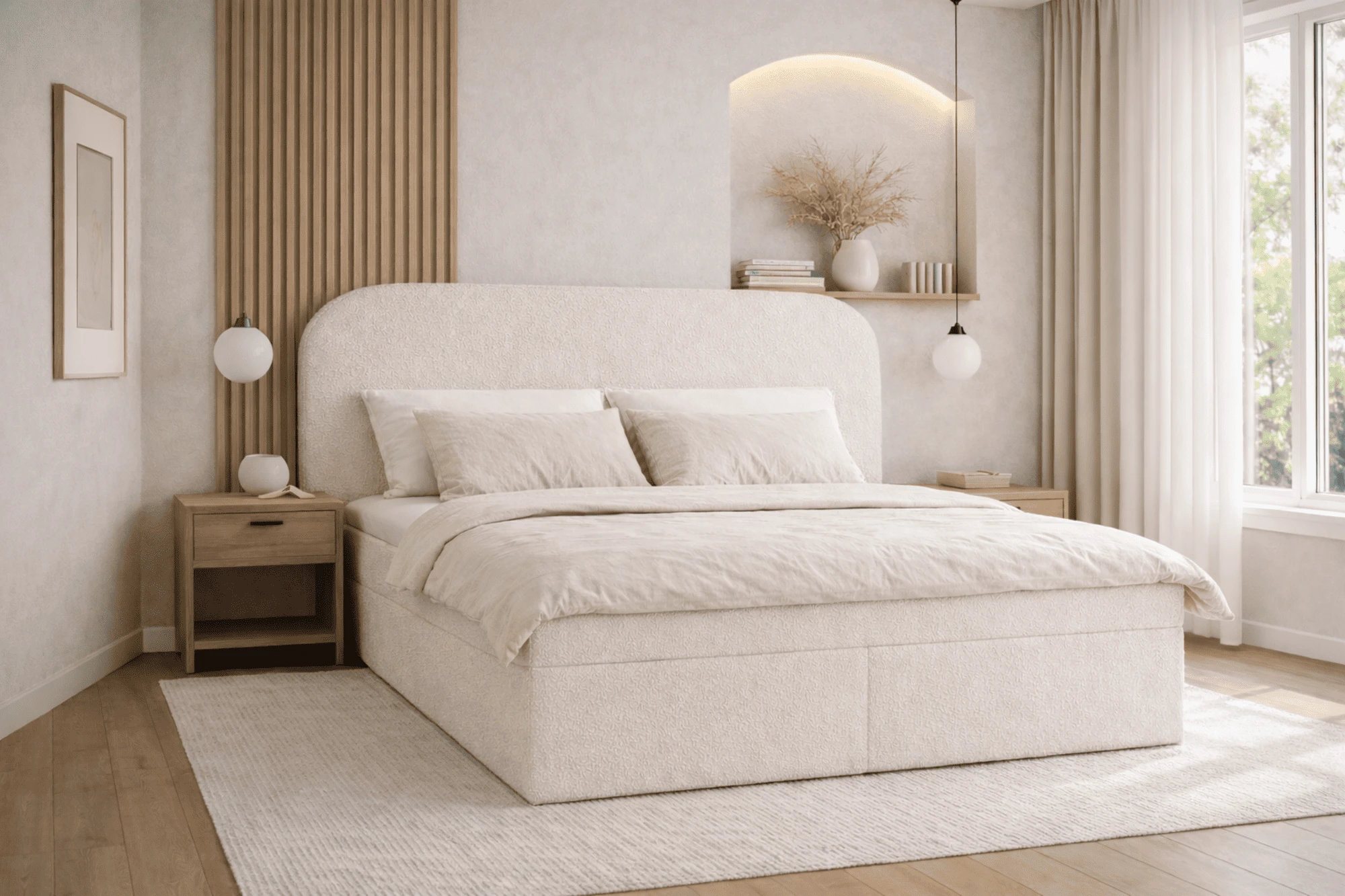 Das Bett 07 ist mit einem Bouclé-Stoff aus der Anthology-Kollektion bezogen, der durch seine weiche, strukturierte Oberfläche für Eleganz und Gemütlichkeit sorgt. Der strapazierfähige und pflegeleichte Stoff fühlt sich angenehm auf der Haut an und steigert den täglichen Komfort.