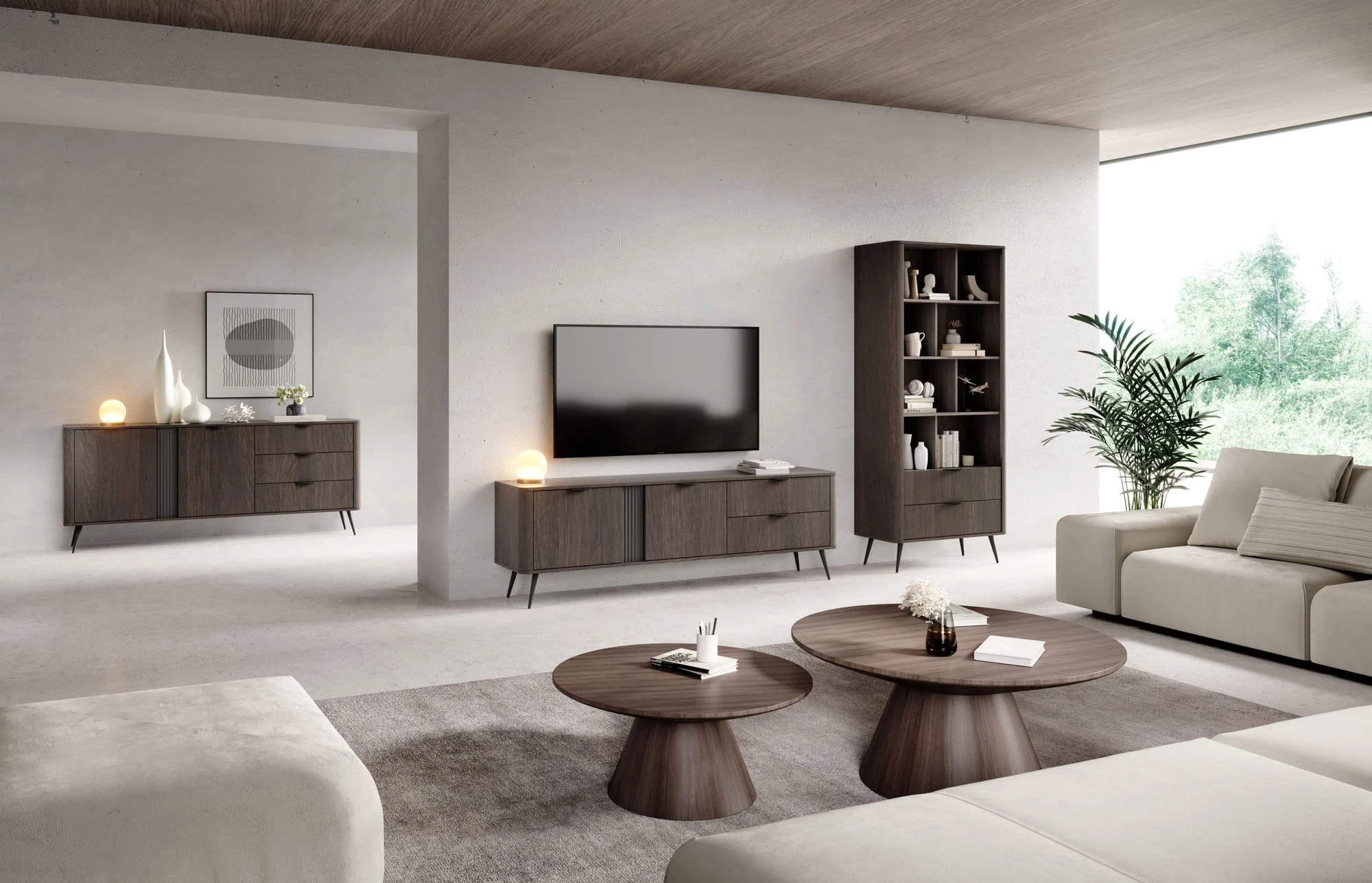 Das Regal 2s LARON steht für modernes Design, natürliche Eleganz und durchdachte Funktionalität. Mit seinem hochwertigen Eiche-Dunin-Dekor strahlt es Wärme und Stil aus, während schwarze Metallfüße und Griffe dem Möbelstück einen trendigen, industriellen Touch verleihen. Die abgerundeten MDF-Kanten und die markante, geriffelte Zierleiste unterstreichen die elegante Formensprache der LARON-Kollektion – perfekt für ein modernes Zuhause mit Charakter.