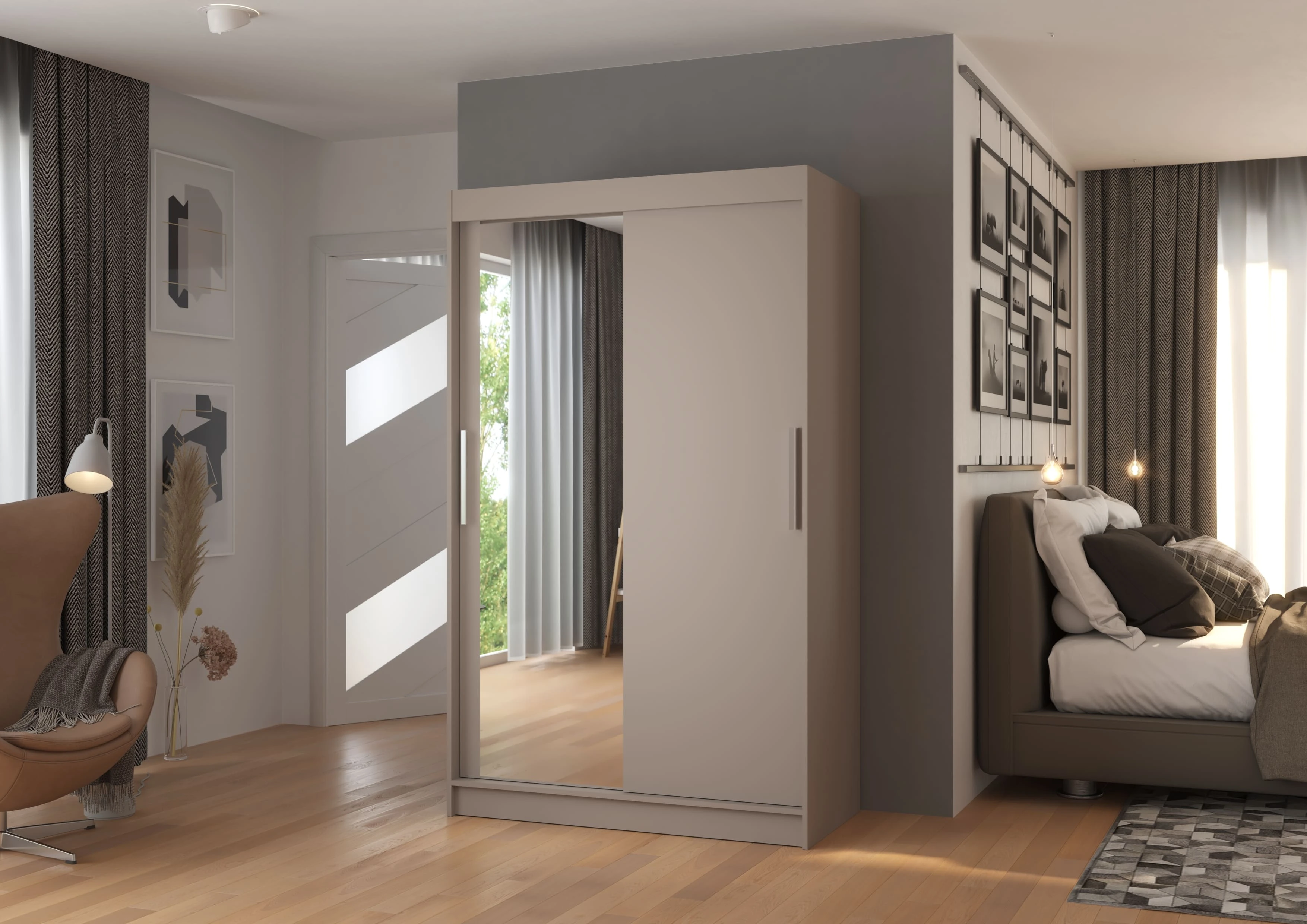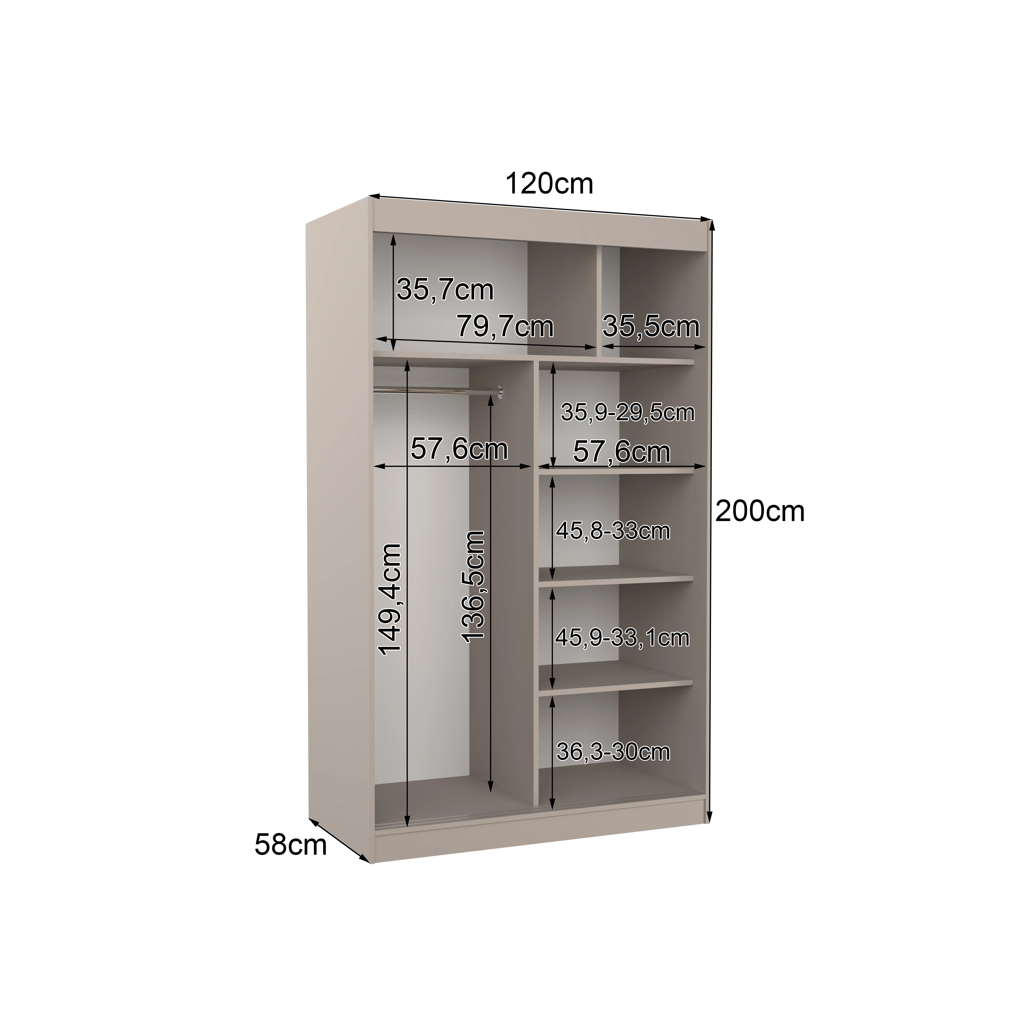 Der Schiebetürenschrank BLOMBERG 120 ist die ideale Lösung, um Ihr Schlafzimmer oder Ihren Flur stilvoll und organisiert zu gestalten. Dank der platzsparenden Schiebetüren benötigen Sie keinen zusätzlichen Platz zum Öffnen der Türen, was diesen Schrank besonders praktisch für kleine Räume oder enge Flure macht.