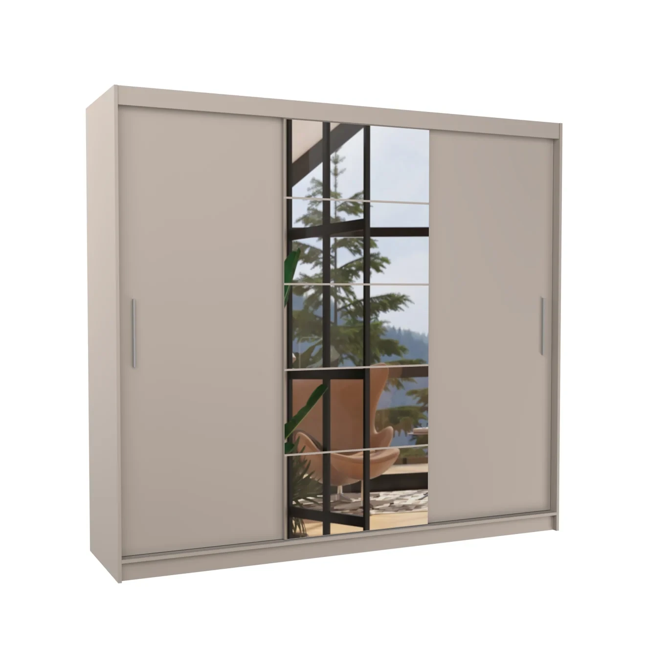Der Schrank ist mit einer Kleiderstange ausgestattet, auf der Sie bequem Kleider, Anzüge, Hemden oder Mäntel aufhängen können. Zusätzlich bieten 5 geräumige Einlegeböden viel Platz für gefaltete Kleidung, Boxen oder andere Accessoires. Die Spiegeltüren erweitern den Raum optisch und lassen Ihr Zimmer heller und großzügiger wirken. Dank des praktischen Schiebetürsystems benötigen Sie keinen zusätzlichen Platz zum Öffnen – ideal für kleine Räume oder schmale Flure.