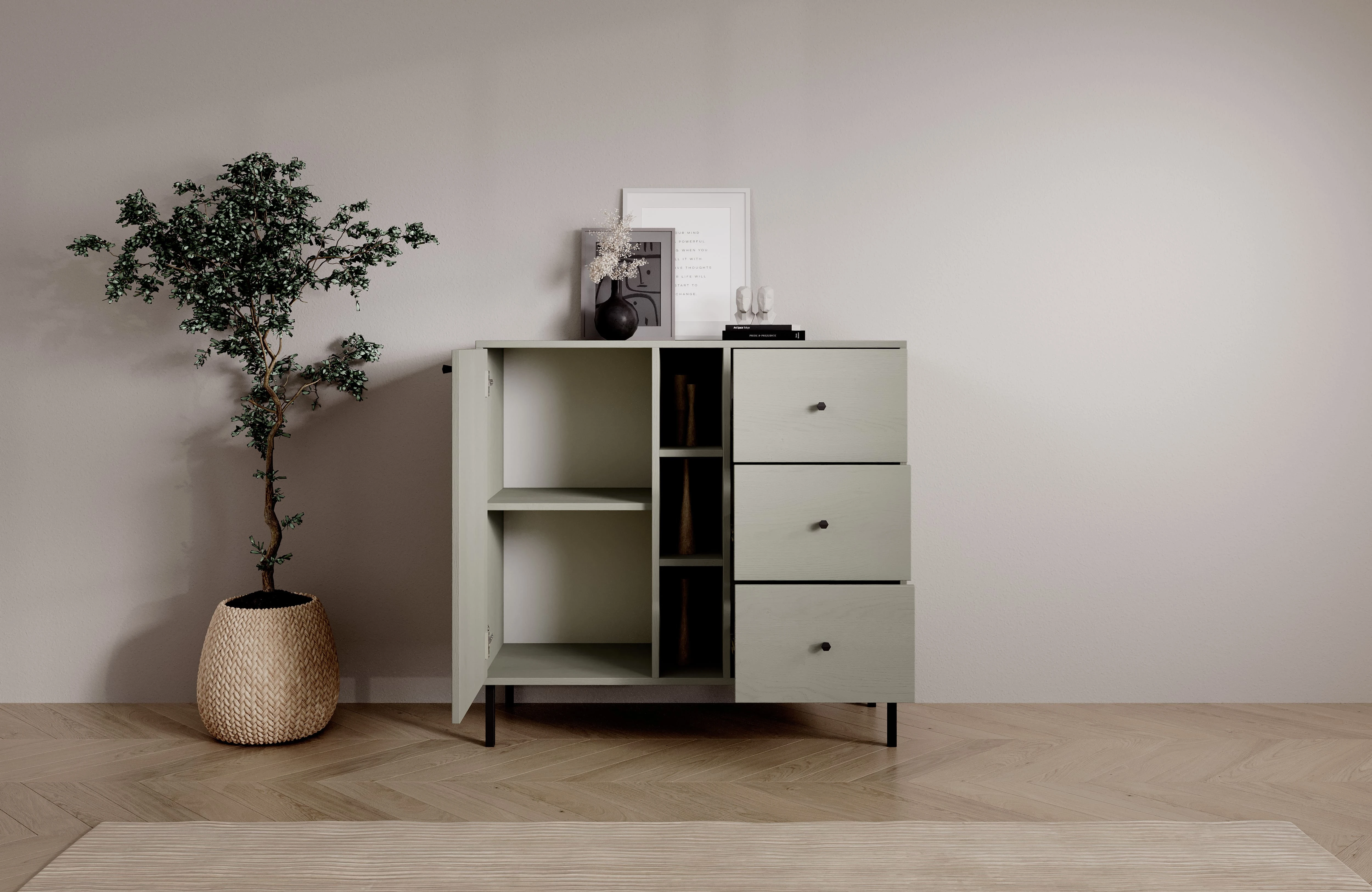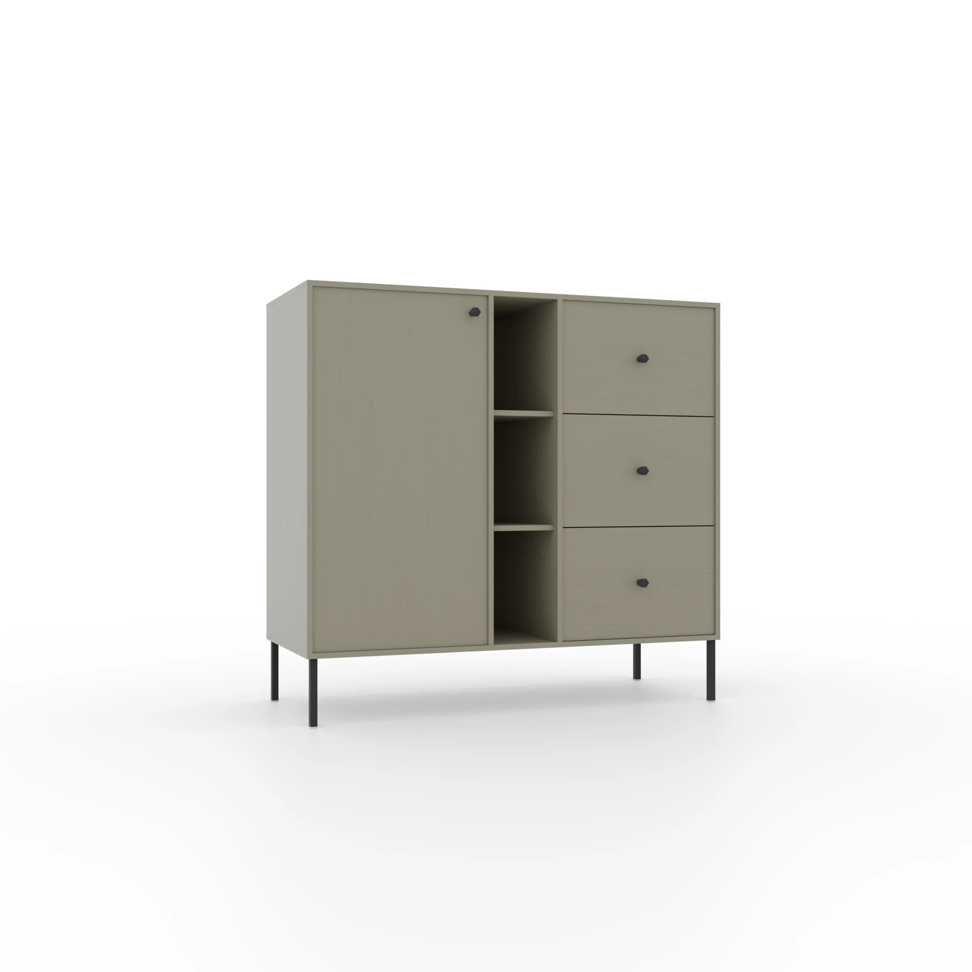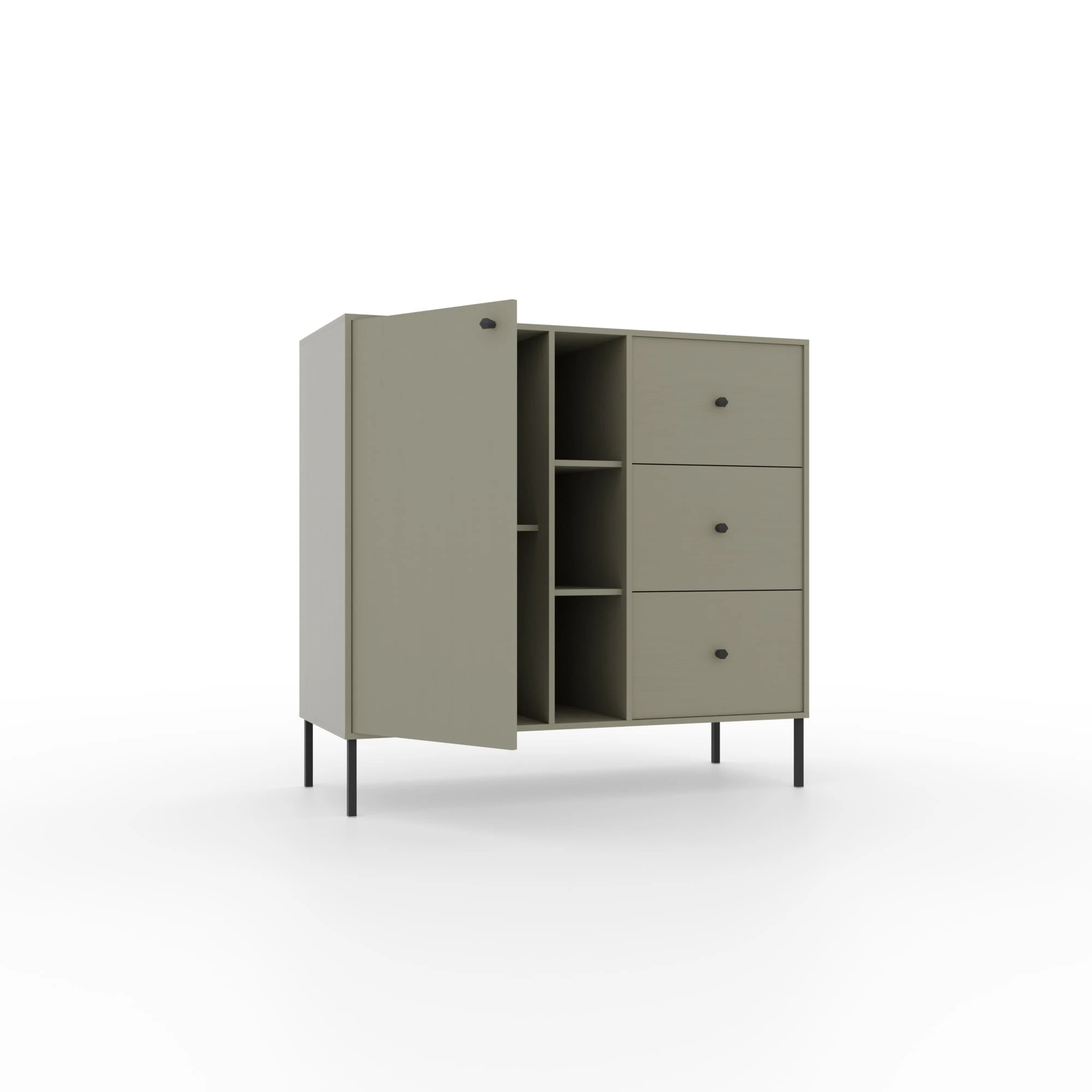 Die Kombination aus einem Türfach, drei Schubladen und drei Einlegeböden bietet reichlich Stauraum für Kleidung, Accessoires oder Wohnutensilien. Die glatten Fronten und dezenten Griffe unterstreichen den modernen, minimalistischen Charakter der Kommode und sorgen für ein elegantes Gesamtbild.