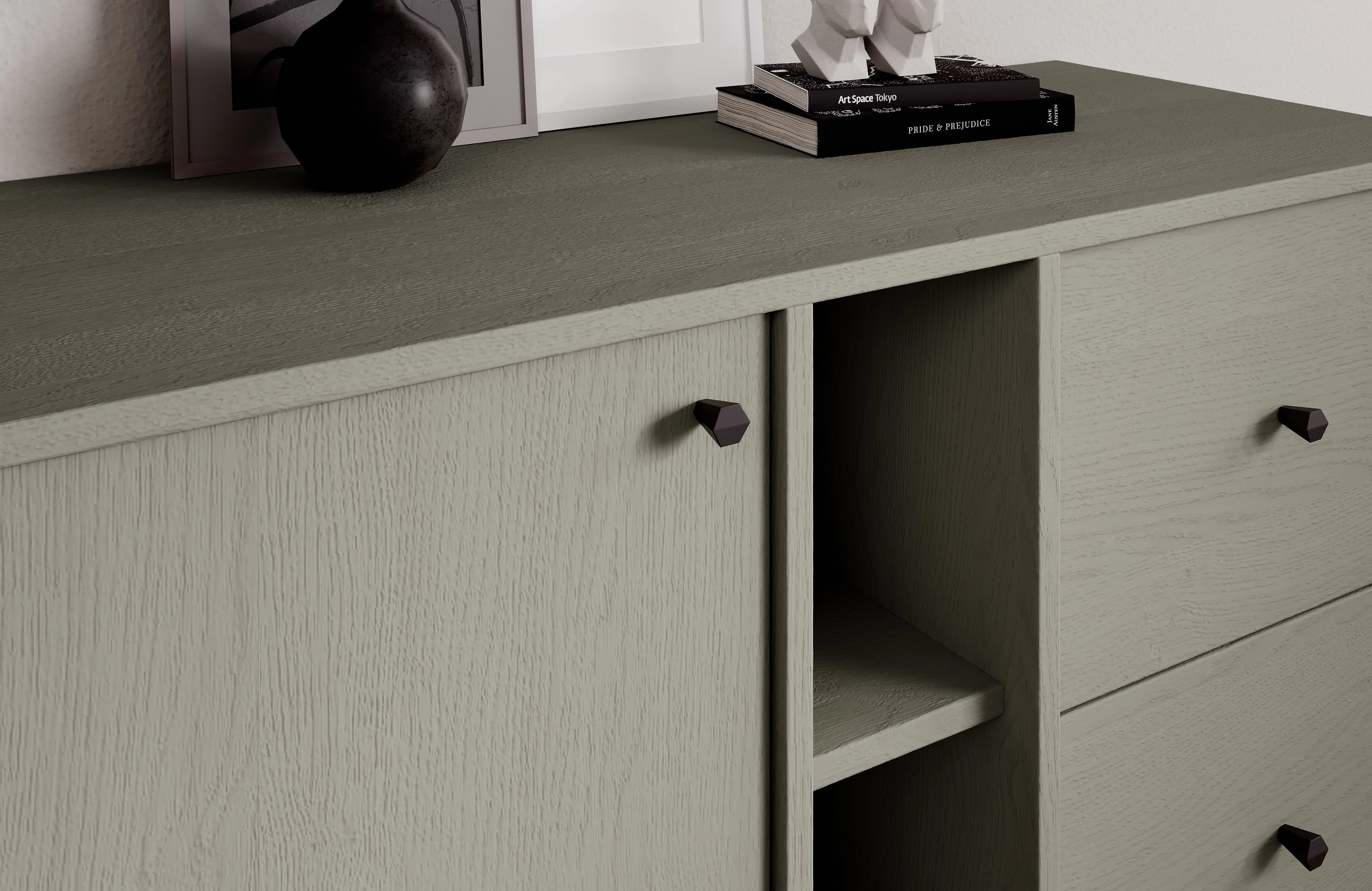 Die Schwarz-Variante verleiht der Kommode einen edlen, modernen Look, ideal für minimalistische Wohnstile. Beige Sand sorgt für Wärme und Harmonie, passend zu hellen, natürlichen Einrichtungselementen. Eukalyptus bringt Frische und einen Hauch Natur ins Zimmer, passend für moderne wie klassische Räume.